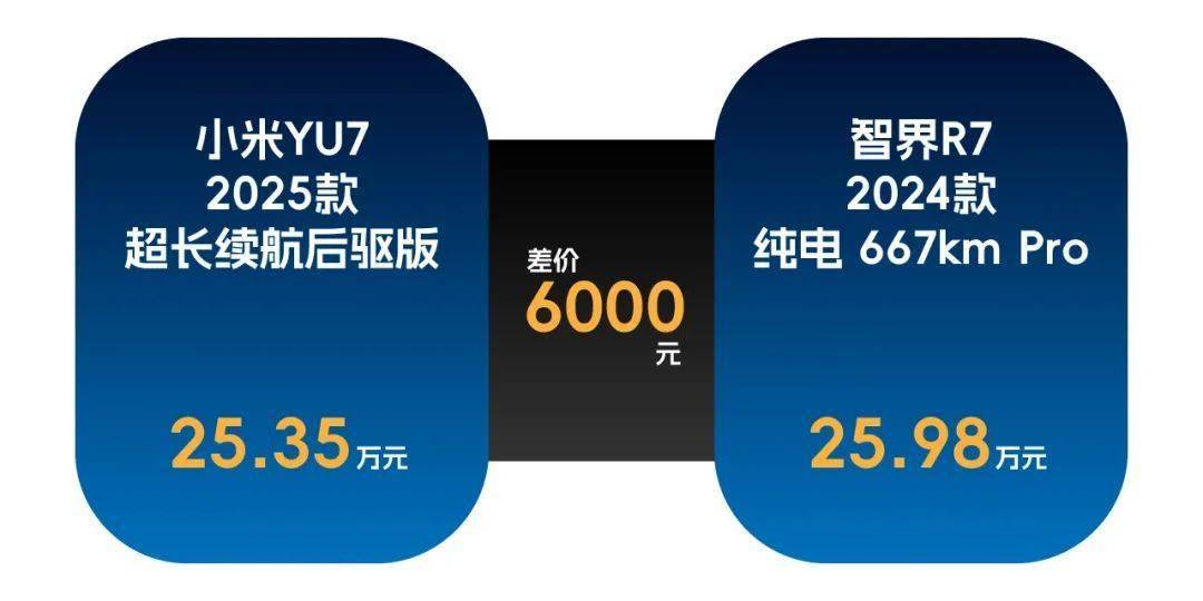其中,小米YU7選擇的是2025款超長續航后驅版,指導價25.35萬元,智界R7的版本則是2024款純電667km Pro,指導價為25.98萬元,兩款車的賬面價差為6000元。