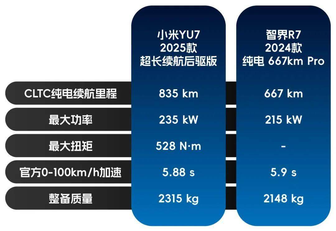 小米YU7 2025款超長續航后驅版的整備質量高達2315kg,智界R7 2024款純電667km Pro只有2148kg,相比之下足足輕了334斤,整備質量大小對0-100km/h加速的影響還是明顯的。