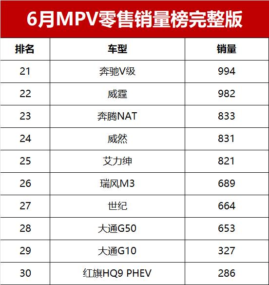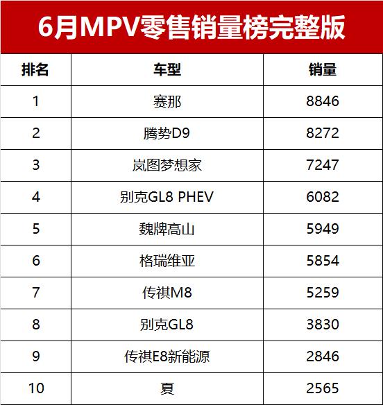 豐田賽那反超騰勢D9,6月份以8846輛的銷量奪得MPV銷量冠軍。作為賽那姊妹車型的格瑞維亞銷量5854輛,排名第六位。豐田的這兩款MPV組合合計銷量14700輛,成為本月MPV市場的第一品牌。