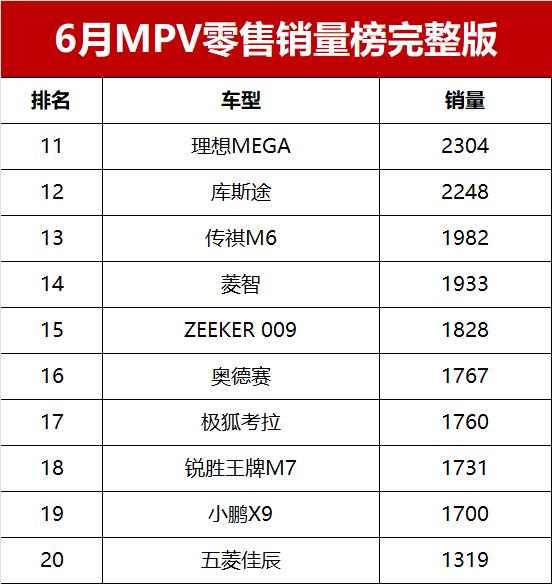 6月份國內MPV市場繼續保持增長的勢頭,乘聯會數據顯示,2025年6月我國MPV市場零售銷量達到9.7萬輛,同比增長14.3%。從各車型銷量來看,6月份銷量超過5千輛的MPV共有七款車型,其中包括三款燃油車和四款新能源車。