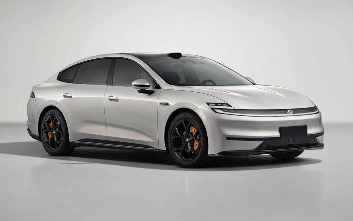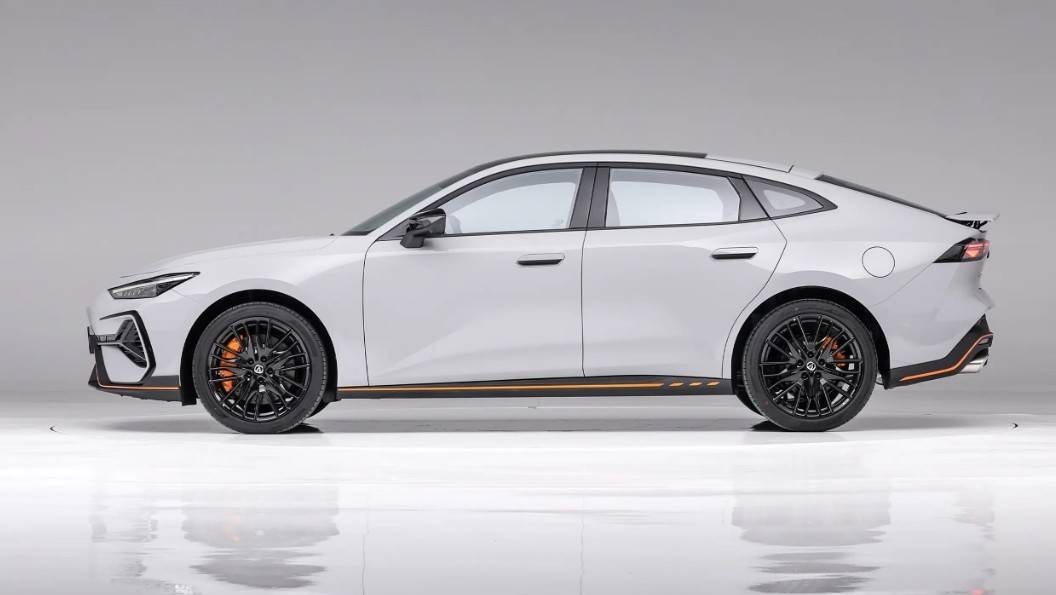 側面仍是經典的溜背式設計,整車風阻系數優化至0.27Cd,提高能耗表現。往下看是19英寸的亮黑密輻式輪圈,搭配醒目的橙色四活塞卡鉗,運動感呼之欲出。