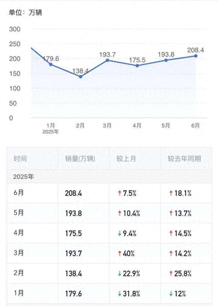 綜合來看,2025年6月中國汽車市場總零售208萬輛,是今年上半年銷量最高的月份。6月月銷量環比增長7.5%,不及去年同期;同比增長18.1%,好于去年同期。