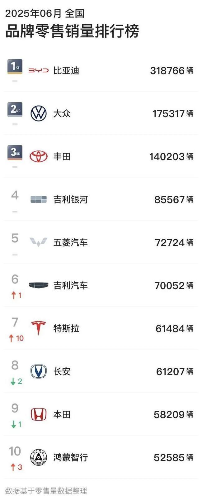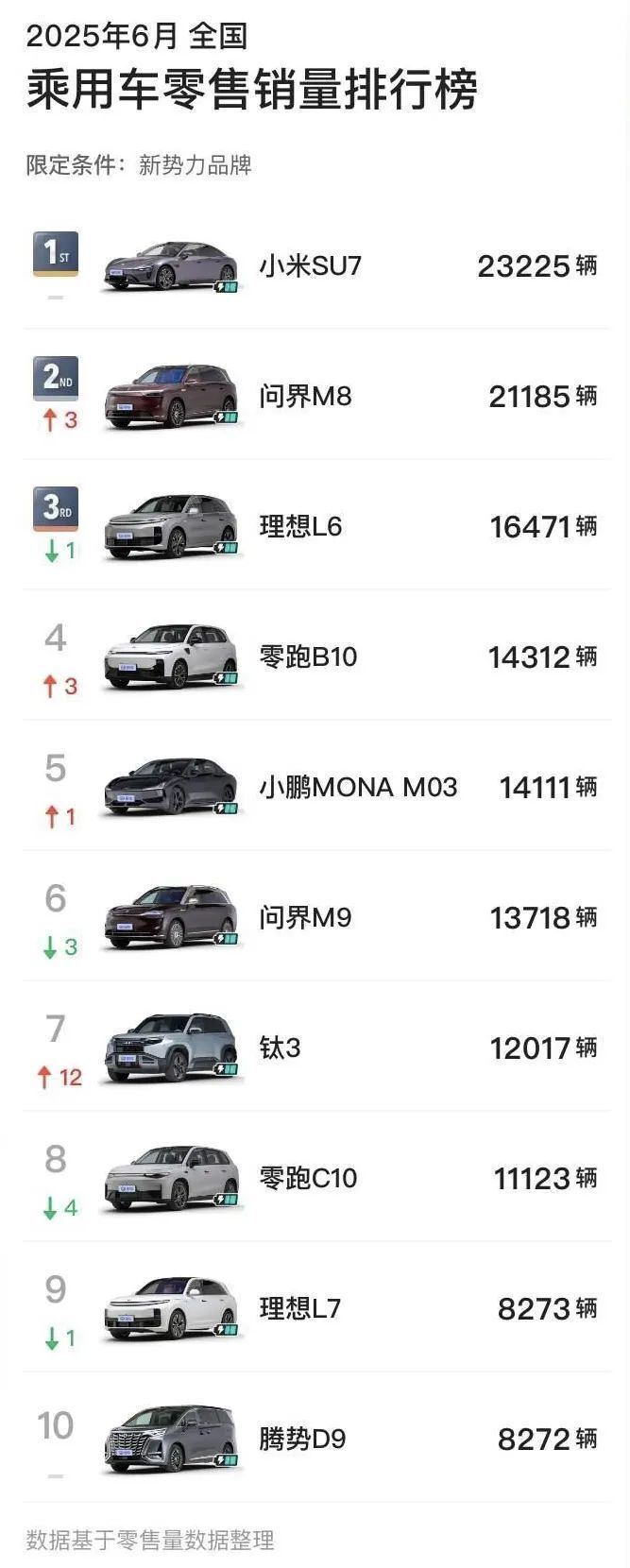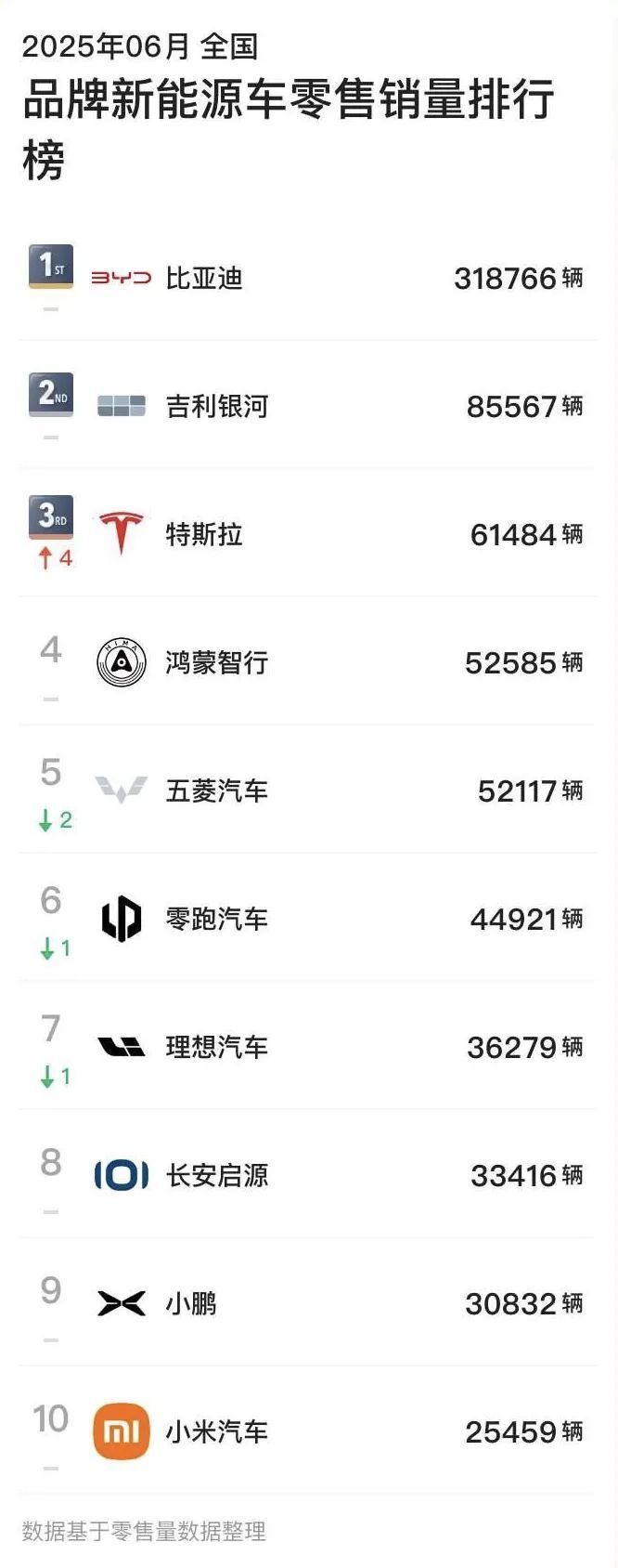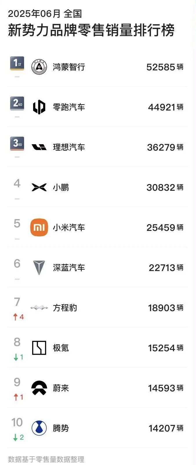 在新能源榜,比亞迪一樣是冠軍選手,6月銷量比亞軍選手吉利銀河多了至少23萬輛。特斯拉本月前進4位,排名第三,銷量達到61484輛。鴻蒙智行、五菱汽車緊隨其后,銷量都在5萬多。零跑汽車、理想汽車排在6、7位,銷量分別在4萬+和3萬+。小鵬以30832輛排在第9,比上周多900輛。小米汽車名列第10,銷量為25459。