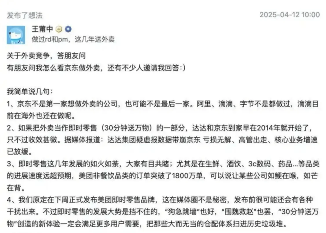 王莆中核心大意有兩點(diǎn):第一,京東不是第一家想做外賣(mài)(即時(shí)零售)的公司,阿里、滴滴、字節(jié)等大廠(chǎng)都曾做過(guò),不必過(guò)于在意.......第二,表明美團(tuán)在即時(shí)零售上的探索與突破,并預(yù)告美團(tuán)閃購(gòu)獨(dú)立上線(xiàn)。