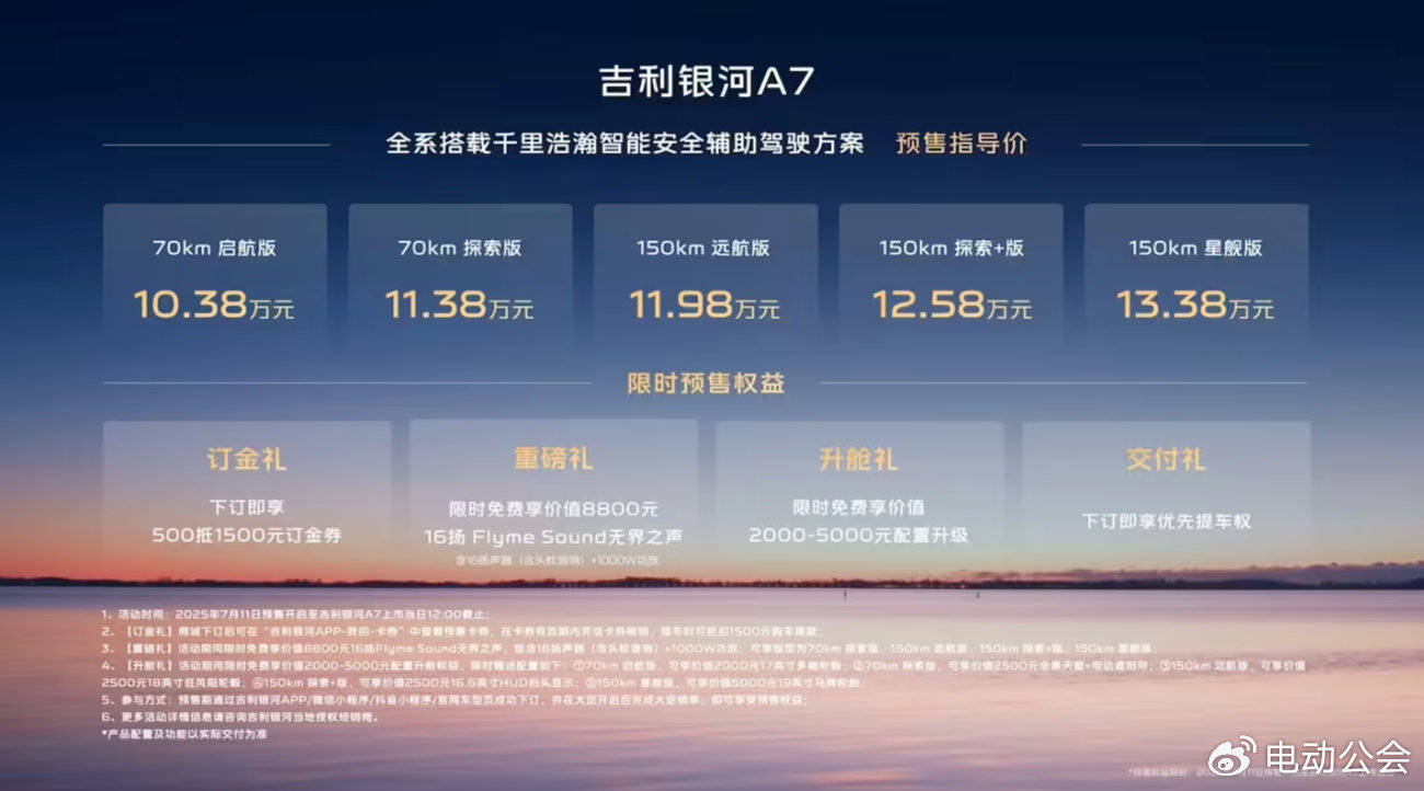 10.38萬元起,吉利銀河A7開啟預售,綜合續航超2100km