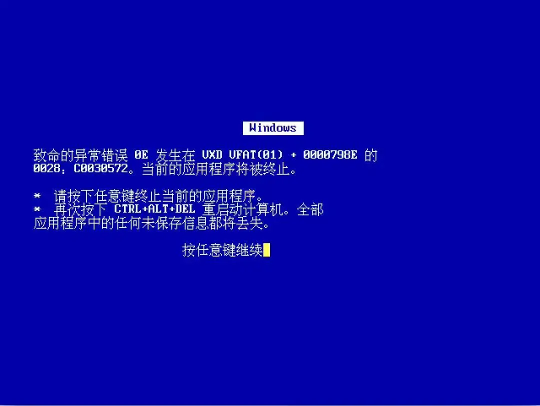 而被大伙熟悉的真正意義上的藍(lán)屏其實(shí)是從 Window 95 和 Windows 98 開始的,這時(shí)候的藍(lán)屏代表著極其嚴(yán)重的系統(tǒng)錯(cuò)誤,直導(dǎo)致電腦崩潰重啟!這個(gè)藍(lán)屏界面大家就很熟悉了吧: