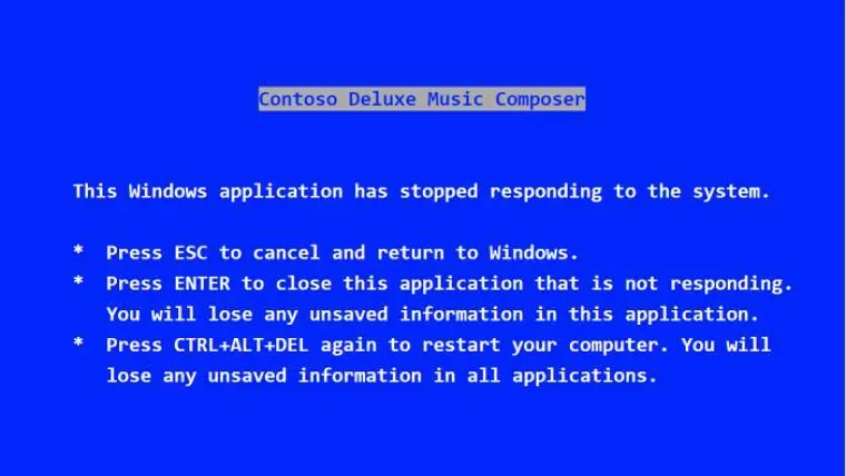 到了 Windows 3.X 的版本中,微軟對(duì)藍(lán)屏界面稍作修改,觸發(fā)條件也發(fā)生了變化:當(dāng)運(yùn)行的程序卡死,并且用戶按下 Ctrl + Alt + Del 組合鍵時(shí)就會(huì)出現(xiàn)這個(gè)藍(lán)屏界面: