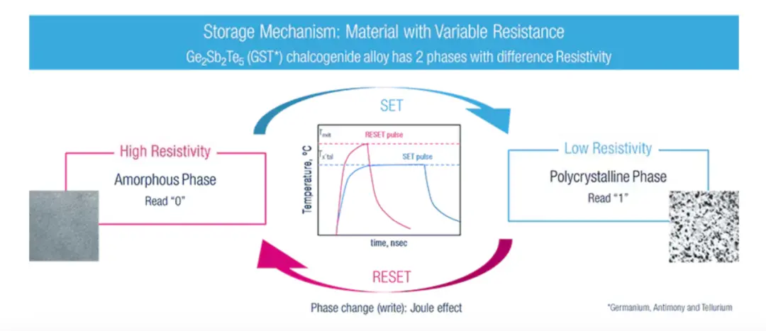 ST在官網中也對PCM的工作原理進行了介紹,PCM采用鍺銻碲 (GST) 合金制造而成,其在制造過程中利用了材料可在非晶態和結晶態之間進行快速熱控制變化的物理特性。上述狀態分別與邏輯0和邏輯1相對應,可通過非晶態(邏輯0)的高電阻和結晶態(邏輯1)的低電阻進行電氣區分。PCM支持在低電壓下進行讀寫操作,且與Flash和其他嵌入式存儲器技術相比,具有多項實質性的優勢。