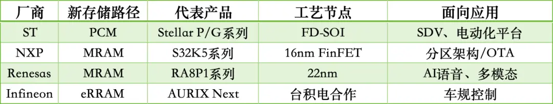 2025年,ST、恩智浦、瑞薩等頭部MCU廠商發布搭載新型嵌入式存儲(如PCM、MRAM)汽車MCU產品,打破了MCU長期以來以嵌入式Flash為主的技術格局