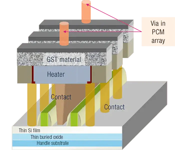 采用FD-SOI技術的嵌入式PCM位單元的橫截面,其中顯示了可在結晶態和非晶態之間快速翻轉存儲單元的加熱裝置。