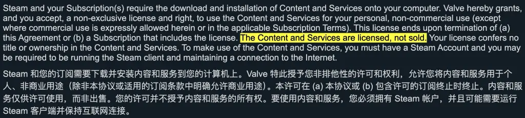 很多人或許也不知道,Steam 有明確的條款注明:平臺上的內容僅供許可使用,而并非直接售賣給用戶。