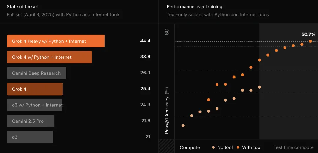 可以看到,在人類最后考試(HLE)上,Grok 4用上工具的得分刷爆SOTA,創下50.7%新紀錄。