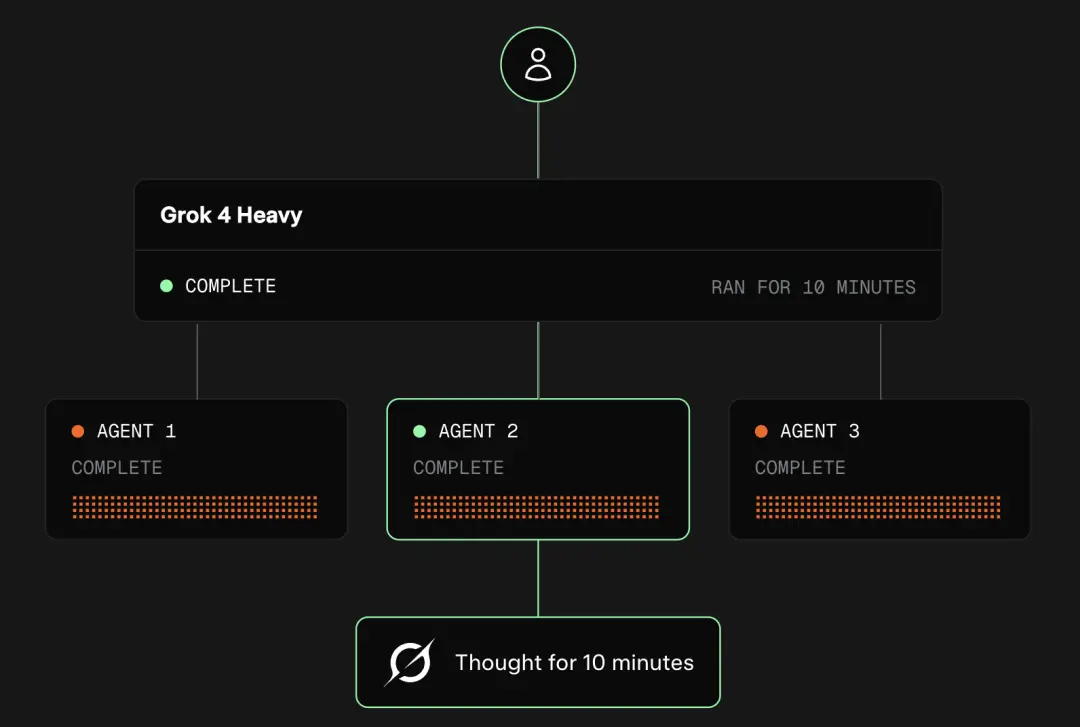 Grok 4 Heavy被稱作是多智能體版,在Scaling測試時計算后,性能得到大幅提升。