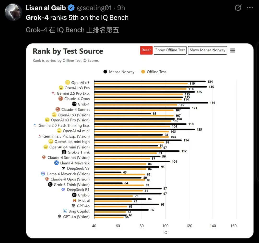 在IQ方面,Grok 4相對來說還是弱一些,在門薩智商測試中,拿下了136分,僅次于Claude 4。