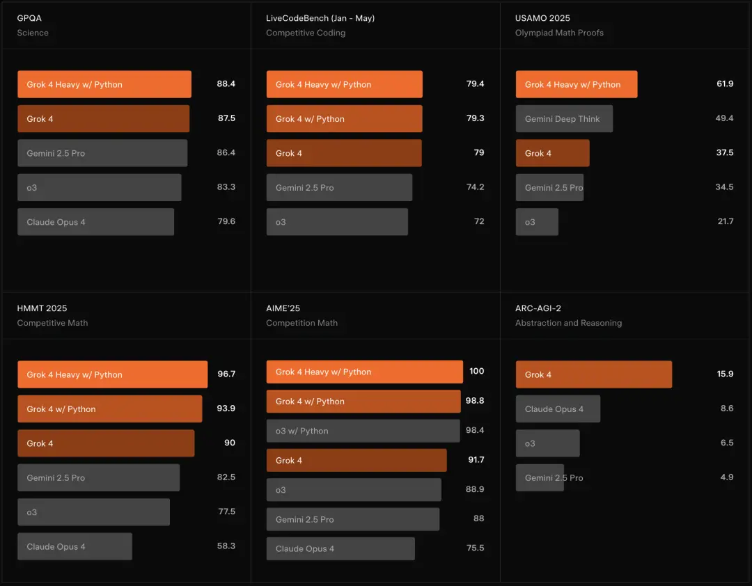 在多項基準測試中,Grok 4系模型全部刷新了SOTA。