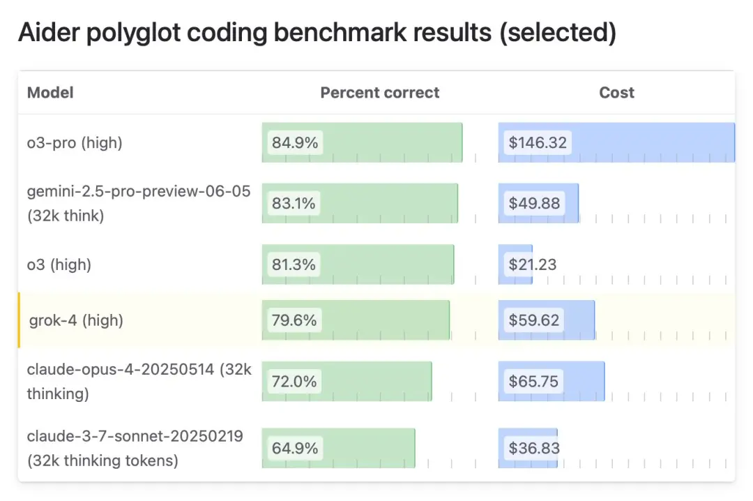 在第三方編程基準Aider測試中,Grok 4位列第四,正確率為79.6%,成本近60美金。