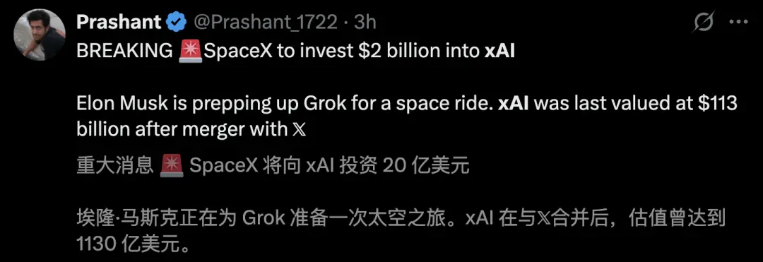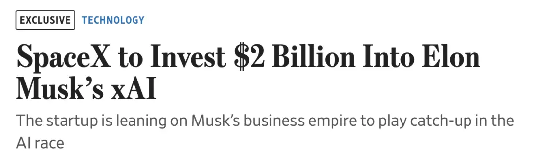 就在剛剛,WSJ爆料稱,SpaceX已同意向xAI投資20億美元。