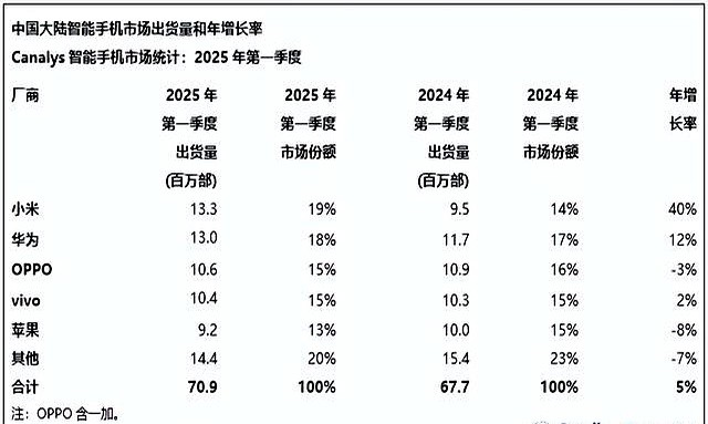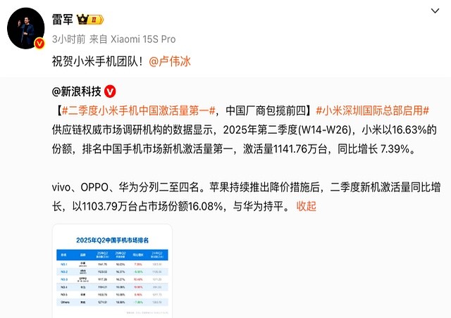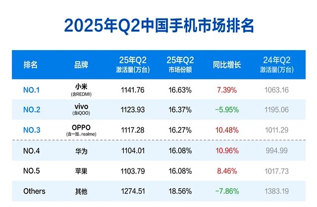 2025年二季度國內手機激活量1141萬臺,市場份額16.63%重回榜首。