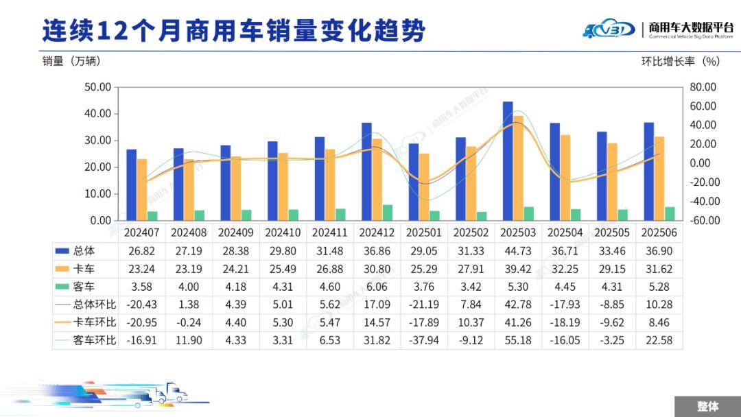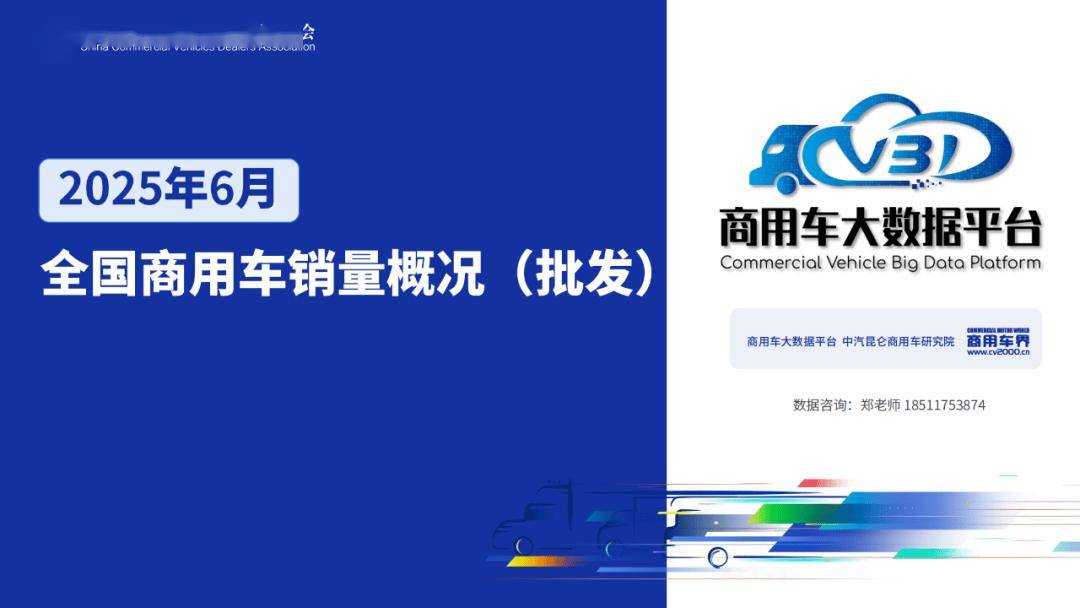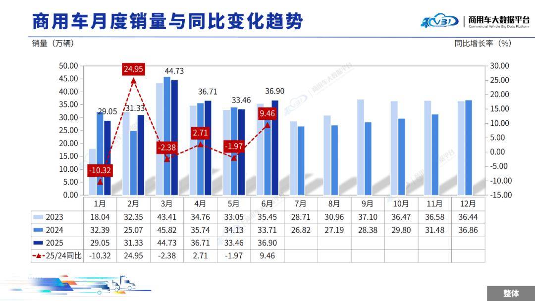 2025年6月全國商用車整體銷量(批發(fā))為36.9萬輛,同比增長9.46%,環(huán)比增長10.28%。1-6月全國商用車?yán)塾?jì)整體銷量(批發(fā))為212.16萬輛,累計(jì)同比增長 2.56%。