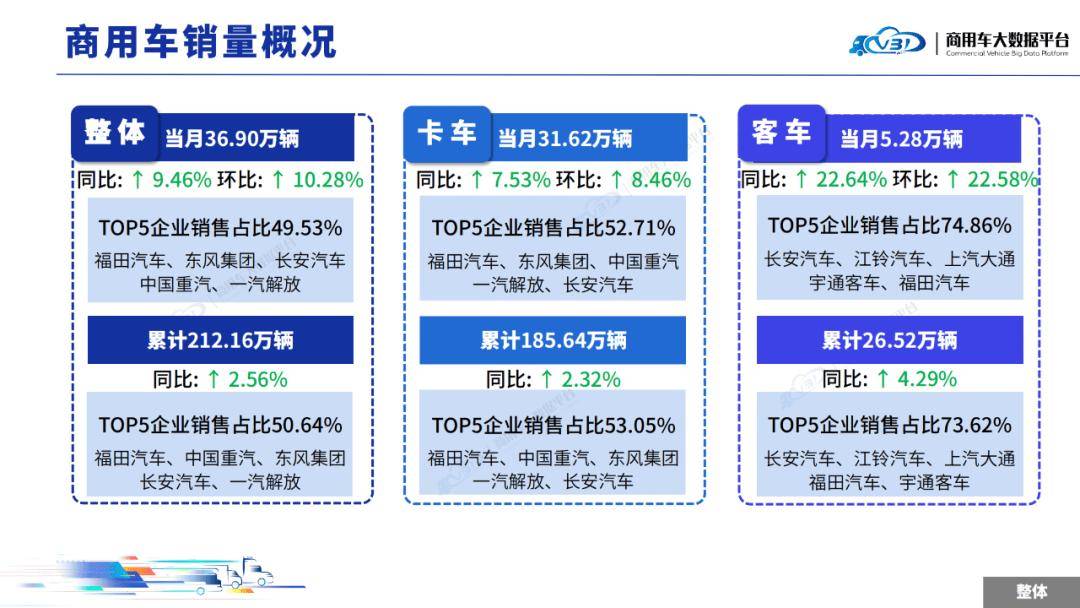當(dāng)月TOP5企業(yè)銷量占比為49.53%,依次為福田汽車、東風(fēng)集團(tuán)、長安汽車、中國重汽、一汽解放。