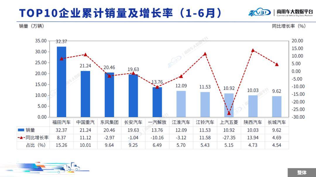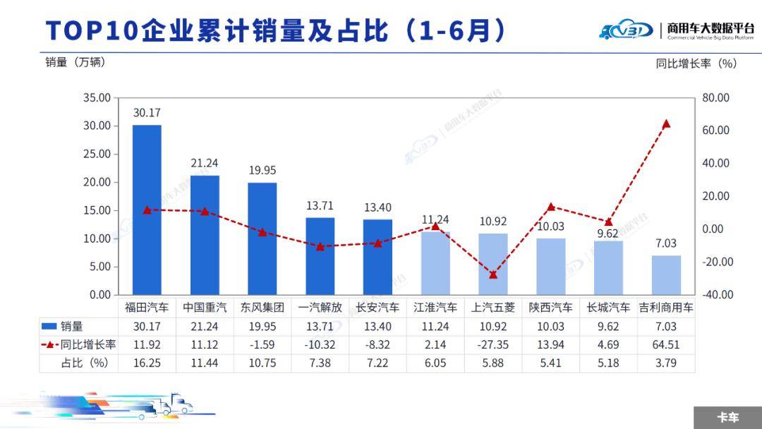 1-6月TOP5企業(yè)銷量占比為53.05%,依次為福田汽車、中國重汽、東風(fēng)集團(tuán)、一汽解放、長安汽車。