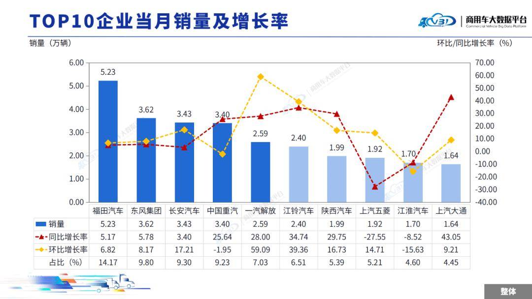 當(dāng)月TOP5企業(yè)銷量占比為52.71%,依次為福田汽車、東風(fēng)集團(tuán)、中國重汽、一汽解放、長安汽車。