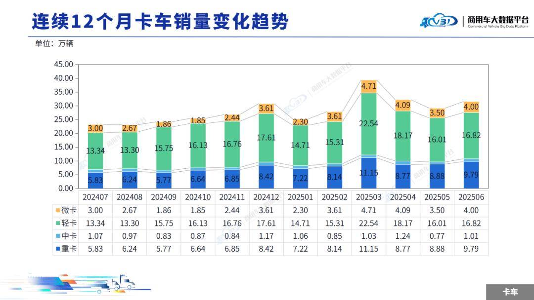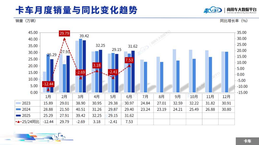 2025年6月卡車銷量(批發(fā))為31.62萬輛,同比增長7.53%,環(huán)比增長8.46%。1-6月累計(jì)銷量(批發(fā))為185.64萬輛,同比增長2.32%。