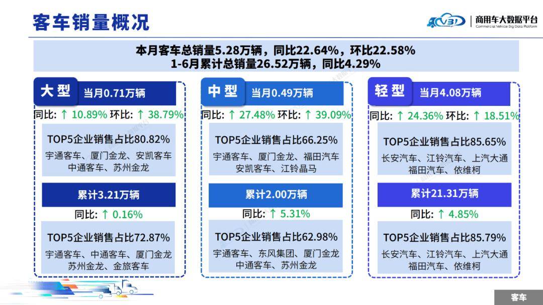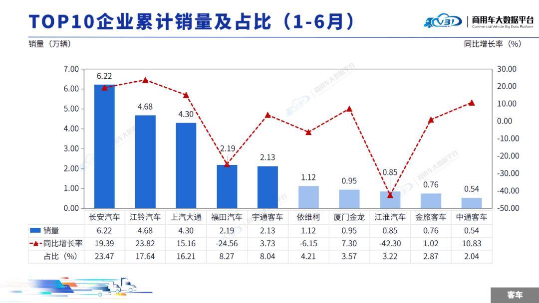 1-6月TOP5企業(yè)銷量占比為73.62%,依次為長安汽車、江鈴汽車、上汽大通、福田汽車、宇通客車。