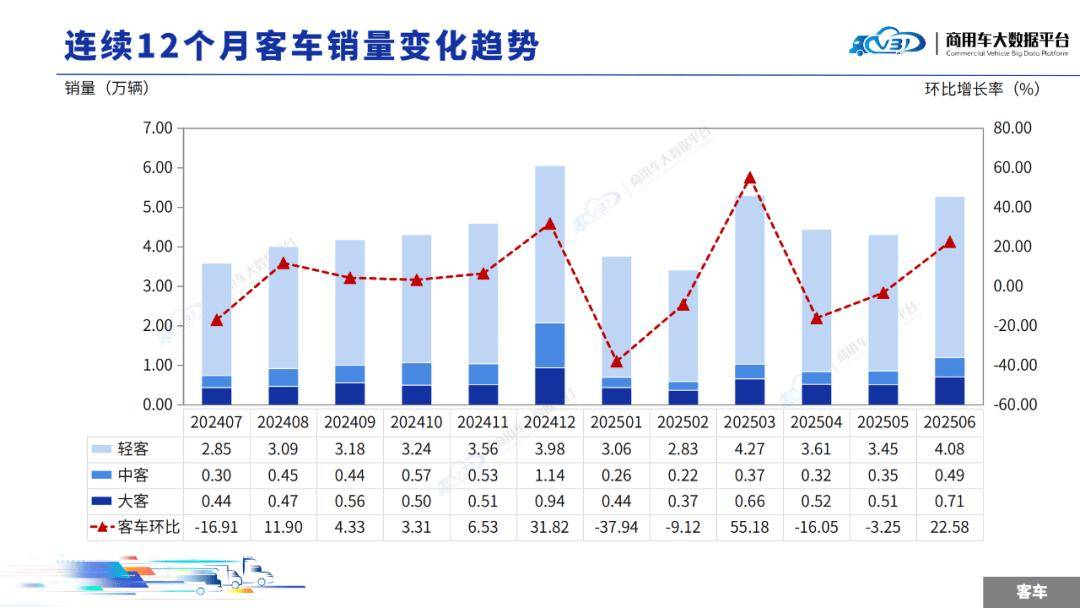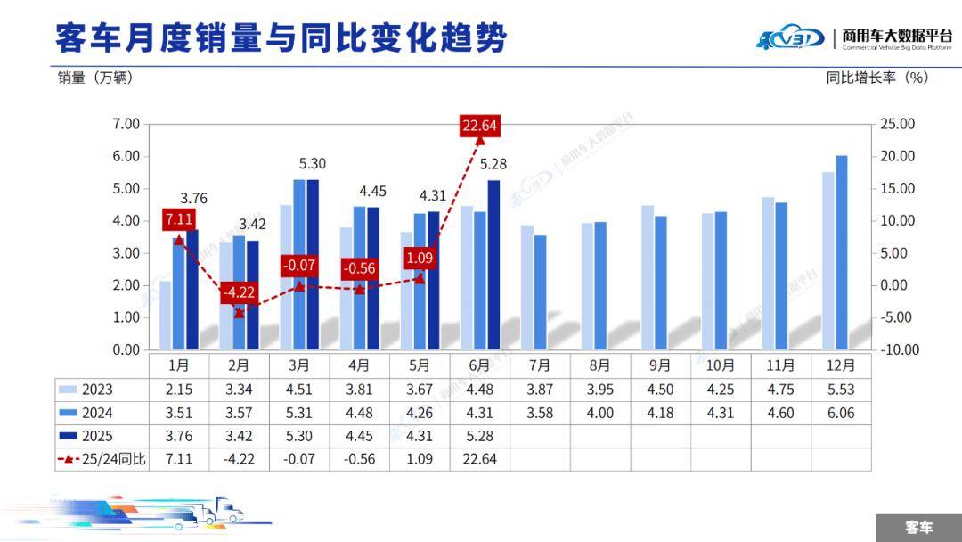 2025年6月客車銷量(批發(fā))為5.28萬輛,同比增長22.64%,環(huán)比增長 22.58%。1-6月累計(jì)銷量(批發(fā))為26.52萬輛,同比增長4.29%。
