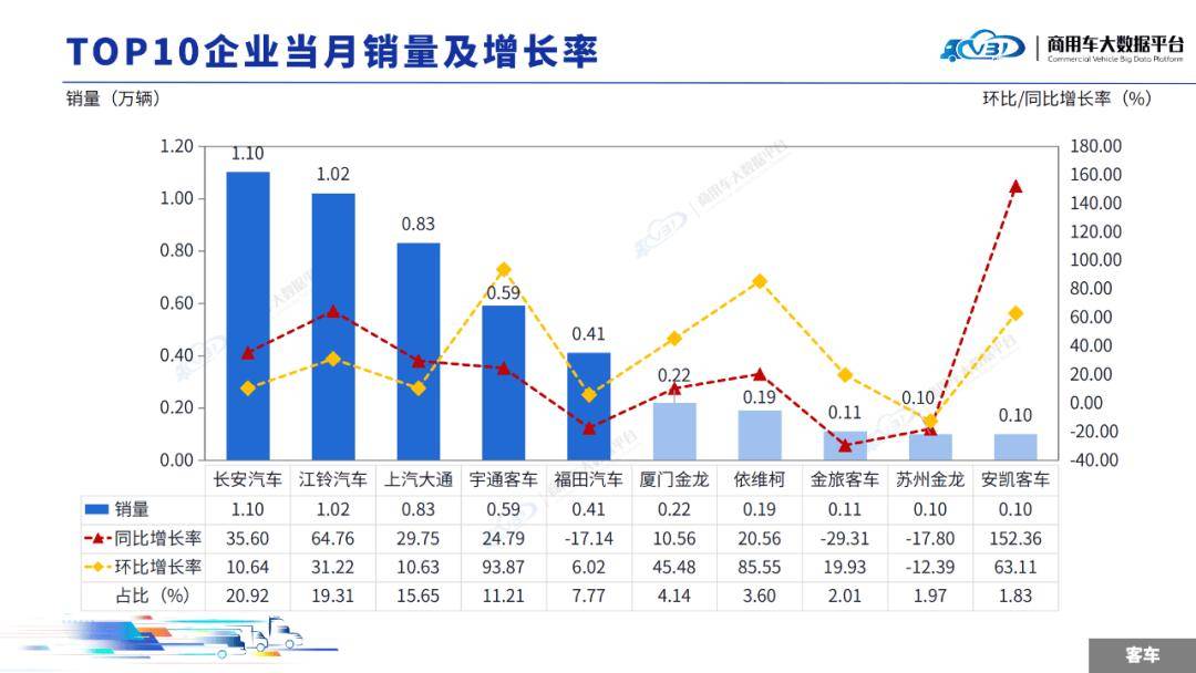 當(dāng)月TOP5企業(yè)銷量占比為74.86%,依次為長安汽車、江鈴汽車、上汽大通、宇通客車、福田汽車。