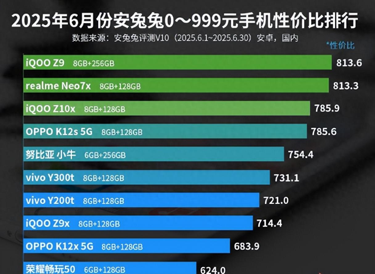 最后,在2025年6月份安兔兔0—999元手機(jī)性價比排行榜中,vivo Y200t和iQOO Z9x分列第七名和第八名。在安兔兔平臺上,這兩款智能手機(jī)的性價比評分分別為721.0分和714.4分。在此之后,OPPO K12x 5G和榮耀暢玩50分列第九名和第十名。在安兔兔平臺上,這兩款智能手機(jī)的性價比評分分別為683.9分和624.0分。其中,榮耀暢玩50搭載了聯(lián)發(fā)科天璣6100+ 5G芯片,最高提供了8GB+256GB的存儲版本,但不支持存儲卡擴(kuò)容功能。