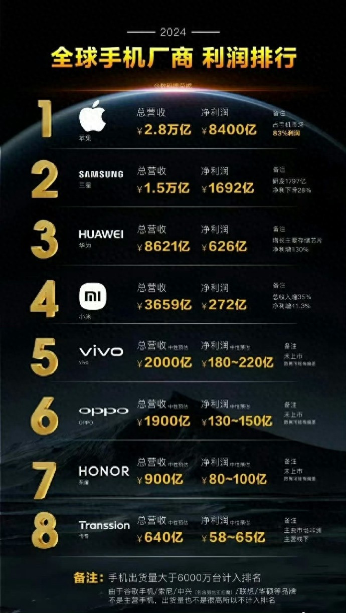 看似一句調侃卻道出了很多蘋果用戶的心酸淚。現實的問題在于iPhone的信號確實不如安卓,但卻對真實的銷量造不成影響,否則蘋果早就改變這一情況了。現實中iPhone在全球范圍之內特別是在高端領域還是首選,相信大家還記得618期間,蘋果在國內大殺四方的情形吧!iPhone 16系列一降價就被瘋搶。且蘋果現在還是全球最賺錢的手機品牌,不信大家看上圖。這是2024年全球手機廠商利潤排行榜。其中蘋果的總營收高達2.8萬億,凈利潤高達到8400億。更牛的是占手機市場利潤的83%。