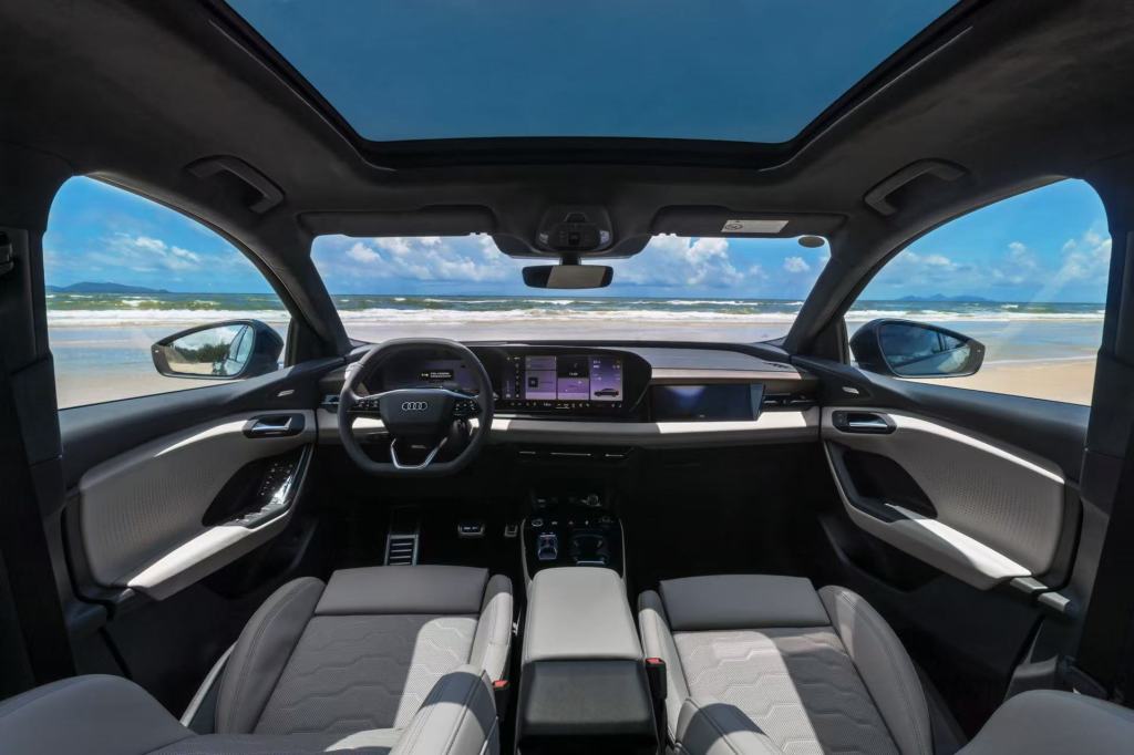 在觸感和氛圍上,Q6L e-tron下足了功夫。大面積覆蓋的超纖絨頂棚提供了翻毛皮的視覺與觸感,軟性材質包裹隨處可見。天然無處理的真皮方向盤保留著天然紋理,觸感溫潤細膩。遍布全車的25處氛圍燈,配合門板獨特的點陣透光打孔技術以及環抱式交互燈帶,共同營造出層次豐富、可個性化定制的沉浸式氛圍。