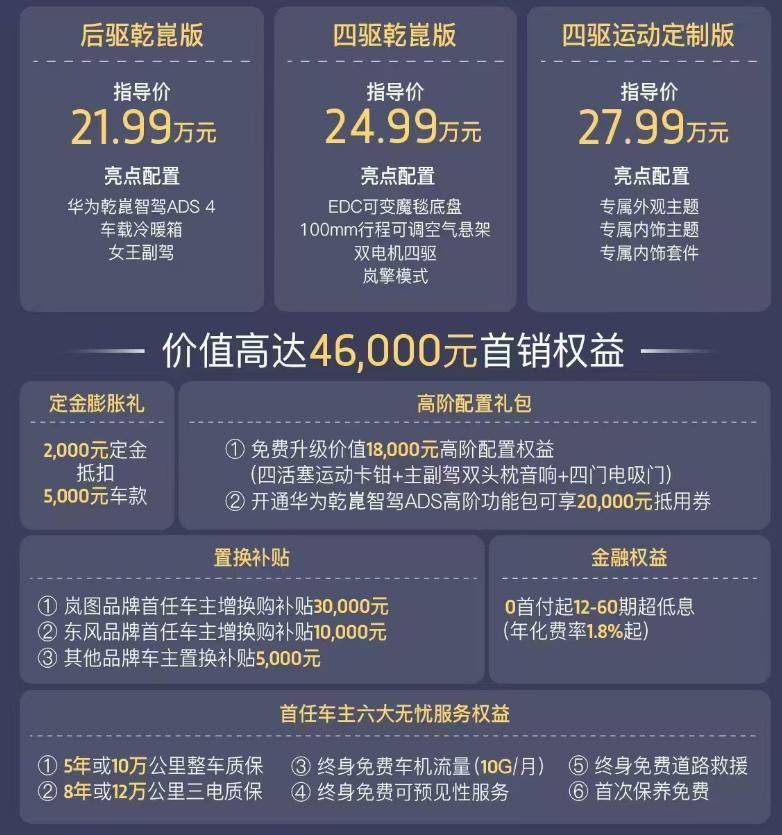 7-12日,嵐圖FREE+公布了上市價(jià)格,21.99萬,還有一個(gè)2000抵扣5000,意味著價(jià)格為21.69萬,加上五六千保險(xiǎn)的話,也就是22.3萬左右,這個(gè)價(jià)格著實(shí)不貴,比之前的預(yù)售價(jià)格便宜了一萬,因?yàn)轭A(yù)售價(jià)早就出來了,所以正式上市價(jià)格基本都是知道了,也就沒了所謂的驚喜。