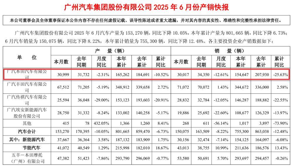 根據(jù)發(fā)布在上海證券交易所官網(wǎng)上的廣汽集團(tuán)6月份產(chǎn)銷(xiāo)快報(bào)顯示,廣汽集團(tuán)6月銷(xiāo)量150075輛,同比下滑8.22%,2025年1-6月累計(jì)銷(xiāo)量755300輛,同比下滑12.48%。已經(jīng)連續(xù)多個(gè)月出現(xiàn)銷(xiāo)量同比下滑的廣汽集團(tuán),可以說(shuō)是遇到了銷(xiāo)量瓶頸。