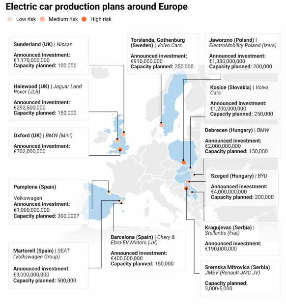 中等風險項目,合計規(guī)劃年產(chǎn)能120萬輛,涉及93億歐元投資,可支撐1.1萬個就業(yè)崗位。其中,比亞迪的匈牙利塞格德Szeged工廠以40億歐元的投資占據(jù)總盤近半,成為清單中規(guī)模最大的項目;其次是西班牙西雅特-大眾工廠改造項目,累計投資30億歐元;還有捷豹路虎與日產(chǎn)正在升級的英國生產(chǎn)基地,預計合計每年生產(chǎn)25萬輛電動車,與沃爾沃哥德堡工廠規(guī)劃相當。