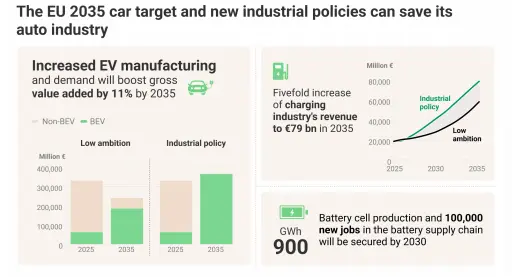報告指出,如果既定的“禁燃”目標被削弱,或是歐盟政策發(fā)生動搖,缺乏全面的產(chǎn)業(yè)轉型規(guī)劃,到2035年,汽車行業(yè)的經(jīng)濟貢獻可能減少900億歐元(折合人民幣約7580億元),充電市場的經(jīng)濟貢獻則將累計損失2000萬歐元(折合人民幣約1.68億元)。