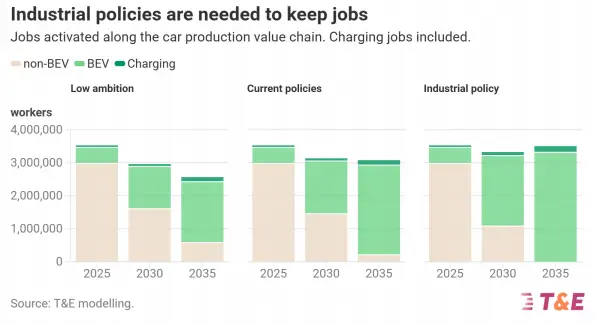一言以蔽之,“禁燃令”一旦半途而廢,沉沒成本是非常巨大的,且還有大規(guī)模失業(yè)的風險。T & E數(shù)據(jù)顯示,如果歐盟保持2035年的“禁燃”目標,并實施推動新興產(chǎn)業(yè)鏈發(fā)展的一攬子政策,那么到2035年,汽車產(chǎn)業(yè)對歐洲經(jīng)濟的貢獻將增長11%。