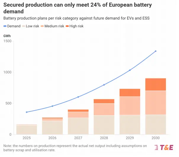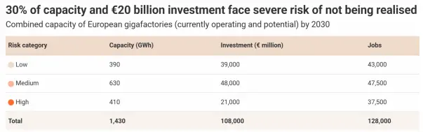 但如果只有低風險項目最終落地,這一比例將驟降至24%,遠低于歐盟2030年40%自給率的目標);計入中等風險項目后,自給率可達52%,但這一數(shù)值也已經(jīng)低于T&E和歐盟先前的預估。受全球及歐盟不利因素(如產(chǎn)業(yè)支持不足)等影響,很多電池項目都有取消或延遲的風險。