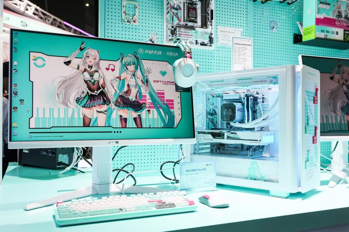 此處還有2臺(tái)以華碩天選B850主板初音未來(lái)版為核心的華碩天選×初音未來(lái)全家桶,搭配AMD銳龍5 9600X處理器、華碩天選RTX5060Ti初音未來(lái)版顯卡、華碩天選850W電源、華碩天選360 LCD初音未來(lái)版一體式水冷和華碩天選A23初音未來(lái)版機(jī)箱等硬件,每一處細(xì)節(jié)都流淌著初音未來(lái)的靈動(dòng)與元?dú)猓瑤?lái)全感官次元體驗(yàn)!