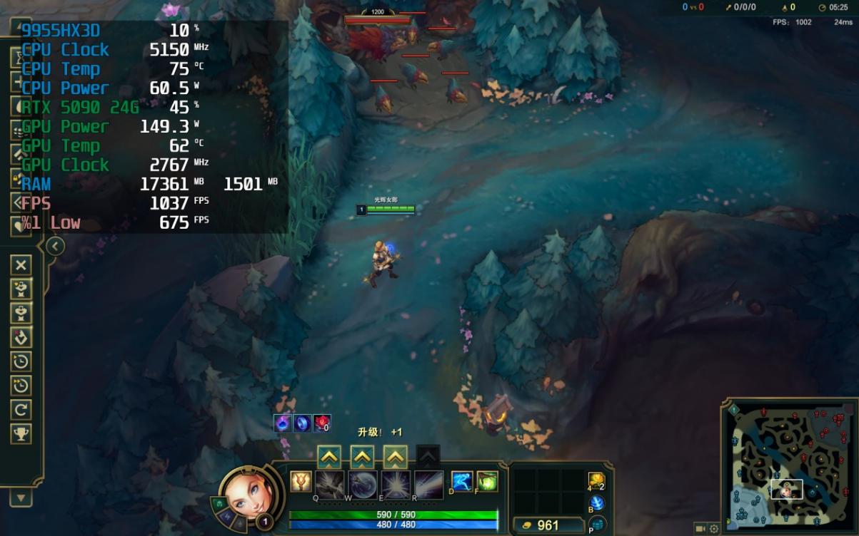 《英雄聯盟》對局中,“千幀電競”的標簽得到了驗證:可達平均每秒1037幀的表現,1% Low幀也控制在675幀的程度,很好地展現了處理器在網游中的實力。