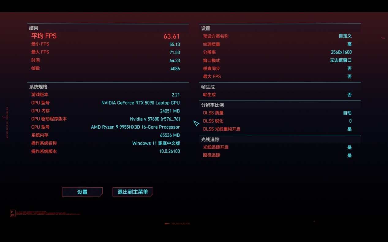 而在開啟DLSS光線重構、路徑追蹤的情況下,機械革命蒼龍16 Ultra則是可以達到平均63.61幀。無論是哪個測試環境,機械革命蒼龍16 Ultra的成績都能流暢把玩,以往基本只能在桌面端上看到,足以呈現這套組合的實力。