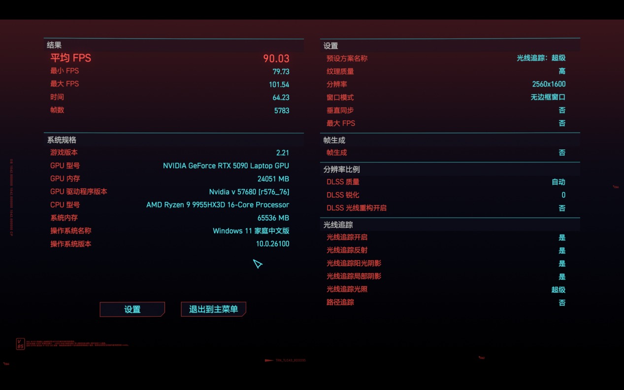 因此,機械革命蒼龍16 Ultra先是通過《賽博朋克2077》Benchmark來展示實力。在使用“光線追蹤:超級”預設,并關閉幀生成的情況下,這套組合可以實現平均90.03幀的成績