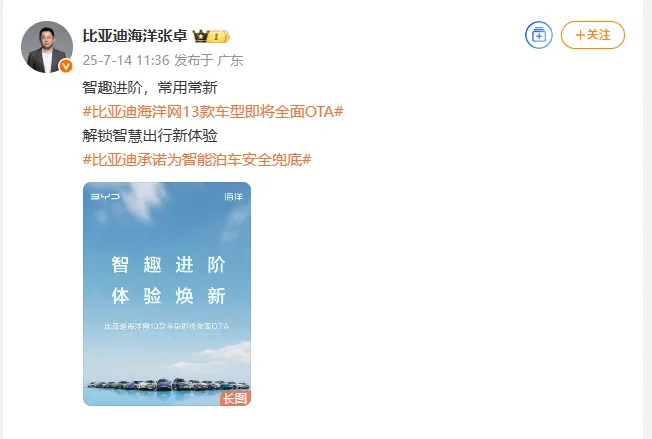 7月14日,比亞迪汽車(chē)海洋網(wǎng)銷售事業(yè)部總經(jīng)理張卓通過(guò)社交媒體宣布,比亞迪海洋網(wǎng)旗下13款車(chē)型即將迎來(lái)全面OTA升級(jí)。此次升級(jí)將帶來(lái)10余項(xiàng)新增功能及體驗(yàn)優(yōu)化,進(jìn)一步提升車(chē)輛的智能駕駛輔助性能與用戶使用感受。