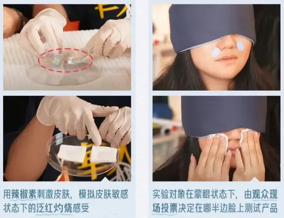 在賣一款冷靜精華時,李嗲讓蒙眼受試者用辣椒素刺激不同部位的皮膚,模擬皮膚敏感狀態下的泛紅灼燒感;再根據用戶現場投票,在不同部位使用不同的產品,最后讓受試者如實反饋感受。帶貨產品必須足夠優秀,才能在單盲測試中勝出;而測試結果也比主播個人推薦更加令人信服。