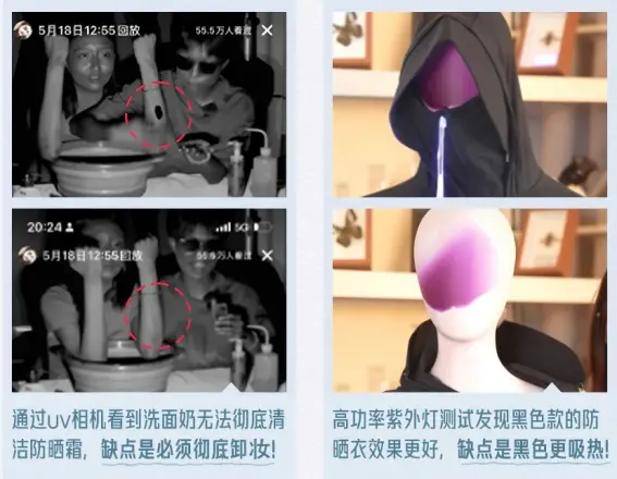 粉絲們很快發現,李嗲主打“勸退式帶貨”。比如,在給一款防曬霜帶貨時,李嗲認為這款產品防水效果很好;但她通過UV相機發現,普通的洗面奶無法清除防曬霜,必須用卸妝產品才能徹底清潔。
