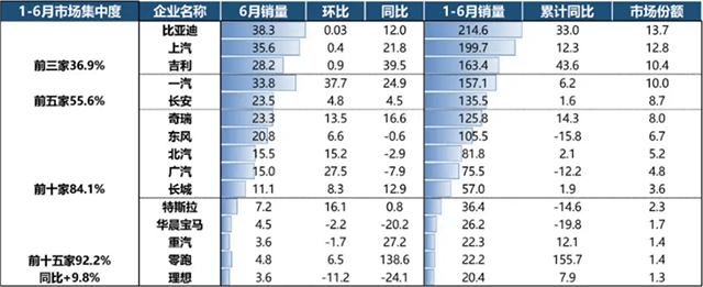 今年上半年,前十五大汽車集團合計銷量1443.4萬輛,占總銷量的92.2%。其中、上汽、吉利、一汽、長安位居前五。新能源車市場則更為集中,前十五大集團合計銷量659.9萬輛,占比高達95.1%,留給二三梯隊的空間越來越小。