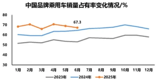 6月,中國品牌乘用車銷量達到170.7萬輛,市占率上升到67.3%;上半年累計銷量達到927萬輛,占比進一步提高到68.5%,比去年同期提升了6.6個百分點。不難發現,6月份的份額低于上半年平均份額1.2個百分點,合資品牌絕地反擊了?