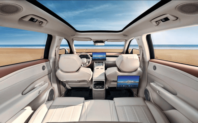 座椅方面,嵐圖FREE+車內座椅采用皮質材料包覆,副駕全系標配“女王座椅”,配備4向電動腿托調節,并提供大角度躺倒設計,最大角度可達163度,支持通風、加熱、按摩功能。后排座椅同樣支持通風、加熱,并且提供后排吸風功能,靠背還具有12度電動調節。副駕座椅后方的HSpace-Link拓展塢支持多種平板電腦,連接后屏幕可獨立使用,也可與中控屏進行交互,為后排乘客提供了豐富的娛樂體驗。