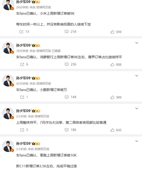 孫少軍表示:“上周整體持平,7月作為大淡季,第二周各家表現(xiàn)都比較普通,小米汽車等車時間一年以上,并沒有影響后面的人繼續(xù)下定。”